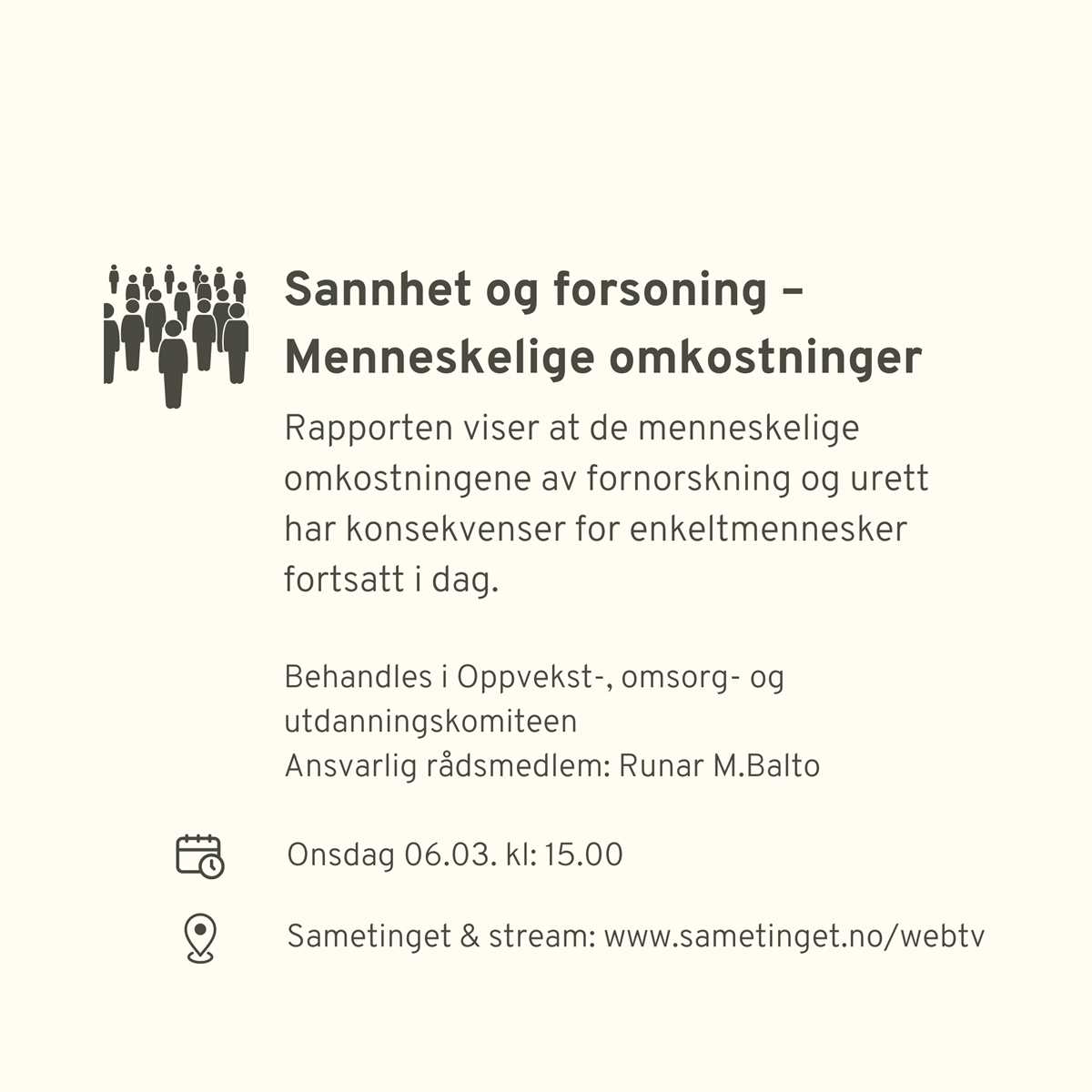Sametinget støtter for øvrig Sametingsrådets forslag til innstilling.Les plenumssaken: Sannhet og forsoning - Menneskelige omkostninger