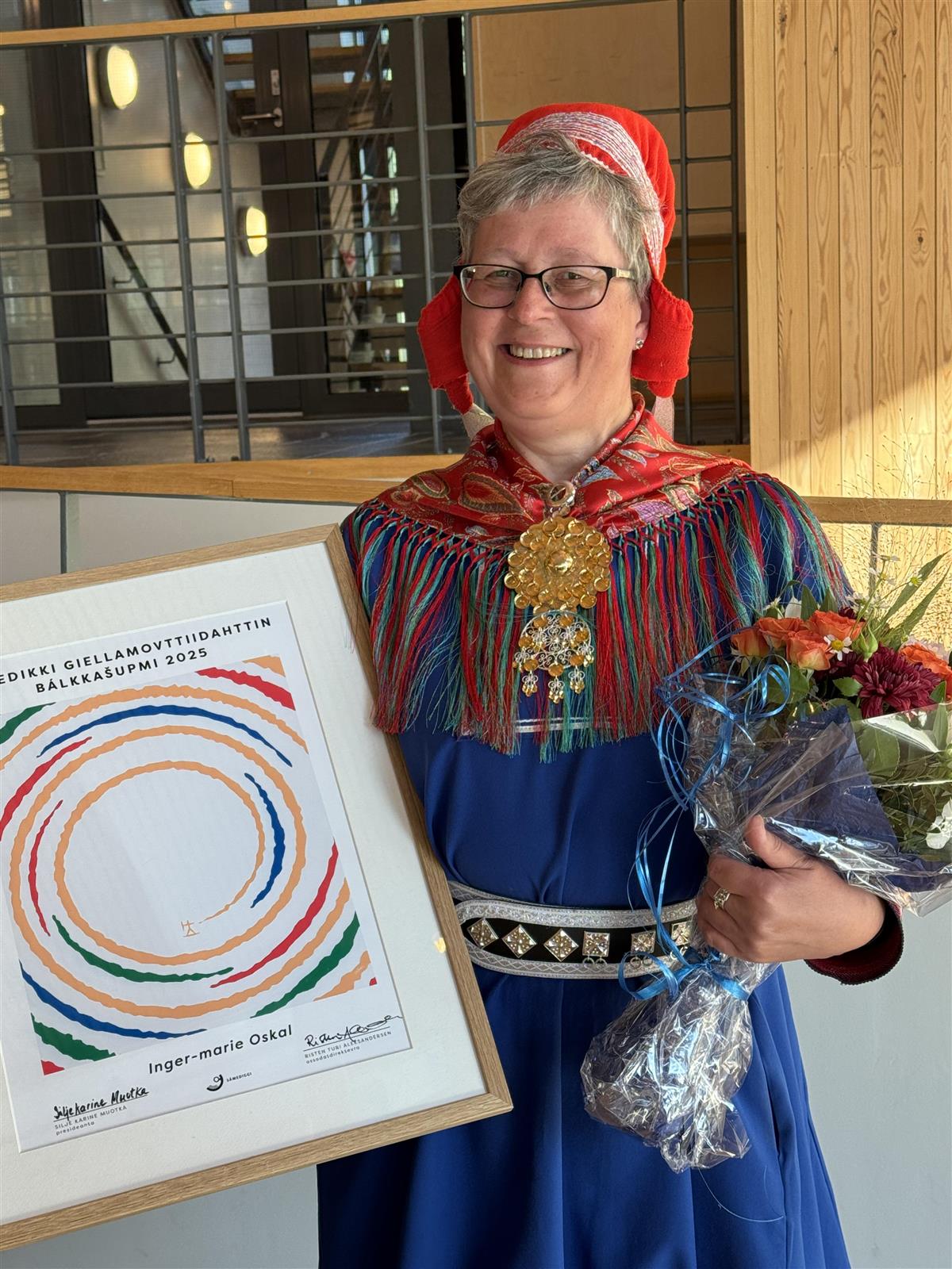 Gjennom sitt arbeid som tolk og oversetter har Inger-marie Oskal gjort vårt hjertespråk, samisk, tilgjengelig for både barn og voksne – i møter, i bøker og på TV. Hun er et godt forbilde og en trygg veileder gjennom sitt personlige engasjement for språkarbeid. Hun har opprettet språkgrupper i sosiale medier med et tydelig mål om å løfte det samiske språket fram på en positiv og inkluderende måte. Hun står også bak de populære koppene med slektsord på nord-, sør- og lulesamisk, som i dag finnes i mange hjem. I tillegg har hun engasjert seg for å få på plass et nytt tolkeutdanningstilbud ved Sámi allaskuvla / Samisk høgskole, et tilbud som starter opp til høsten.