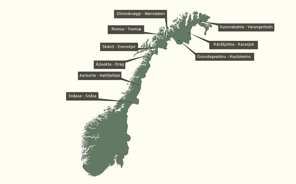 Vuonnabađas Unjárggas, Guovdageainnus, Olmmáivákkis Gáivuonas, Romssas, Ájluovttas Hábmeris, Skániin Dielddanuoris, Aarbortes ja Snåases.